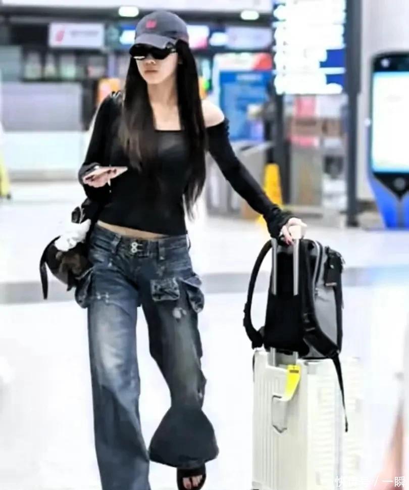 这密斯是真会长,简通俗单的玄色露肩上衣配牛仔裤,戴个棒球帽和墨镜,那身高那气质那大长腿,星范儿足够!我方拉着箱子走在后头,又酷又独处。